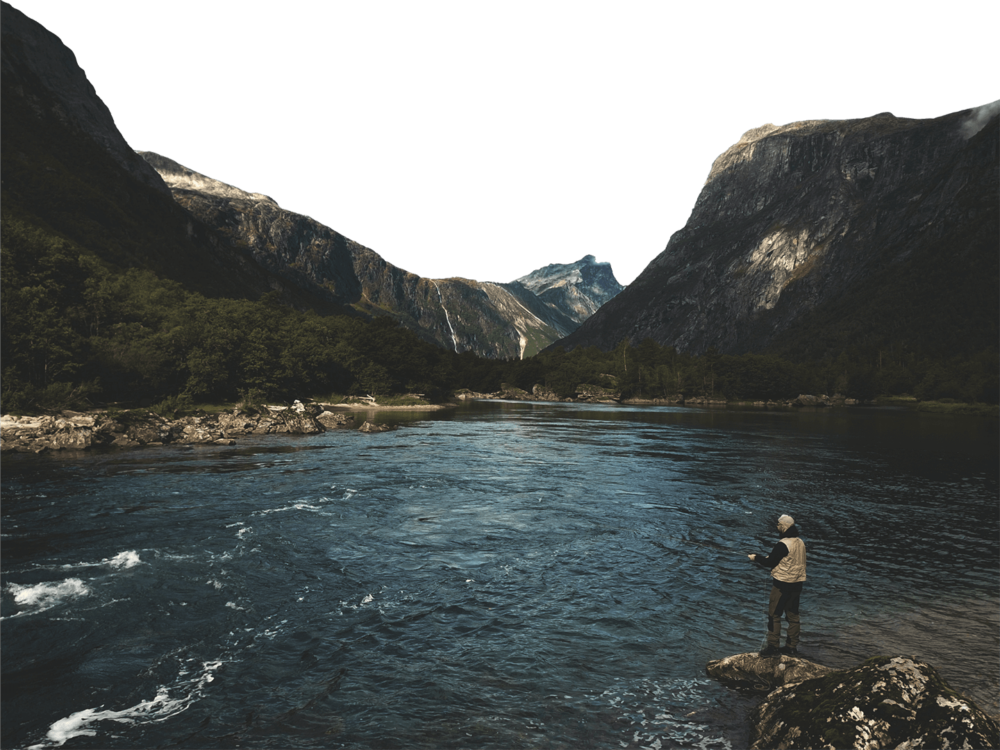 Laksefiske i Rauma Elv: Fra stilleflytende partier til brusende fossestryk - i en trang dal mellom steile fjell